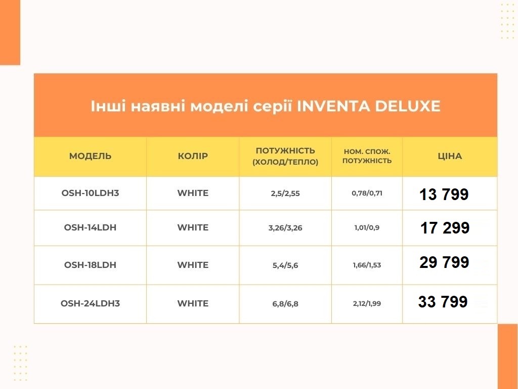Усі ці особливості роблять кондиціонер серії INVENTA DELUXE ідеальним вибором для вашого будинку або офісу. Він дозволить вам насолоджуватися комфортним кліматом і ефективно керувати температурою у вашому приміщенні, забезпечуючи максимальний комфорт і економію енергії.