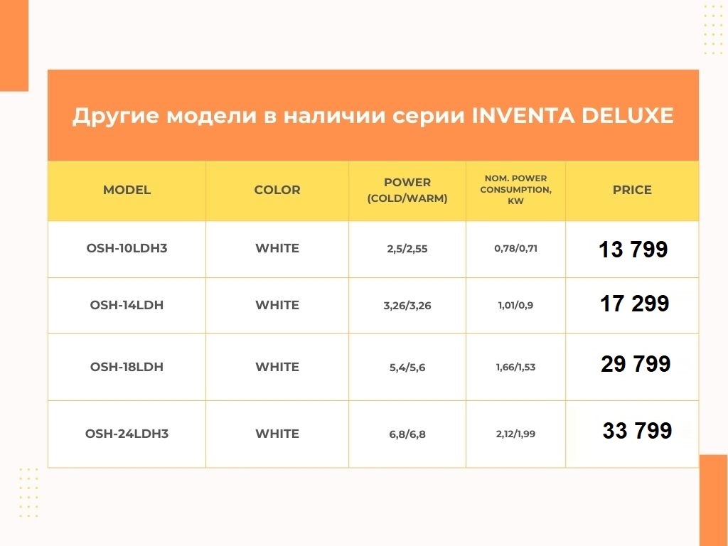 Все эти особенности делают кондиционер серии INVENTA DELUXE идеальным выбором для вашего дома или офиса. Он позволит вам наслаждаться комфортным климатом и эффективно управлять температурой в вашем помещении, обеспечивая максимальный комфорт и экономию энергии.