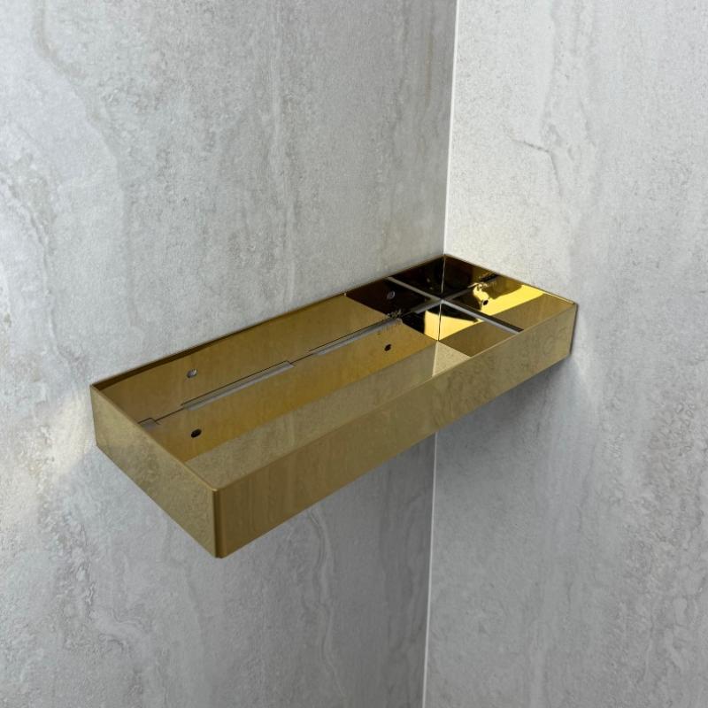Глянцева золота поверхня надає виробу розкішного вигляду та відбиває світло, створюючи приємний блиск. Поверхня легко очищується, не залишає слідів від пальців, не тьмяніє з часом і не потребує складного догляду. Золота полиця гармонійно поєднується з іншими аксесуарами в аналогічному кольорі, зокрема з рушникосушками, змішувачами та тримачами, доступними на нашому сайті.